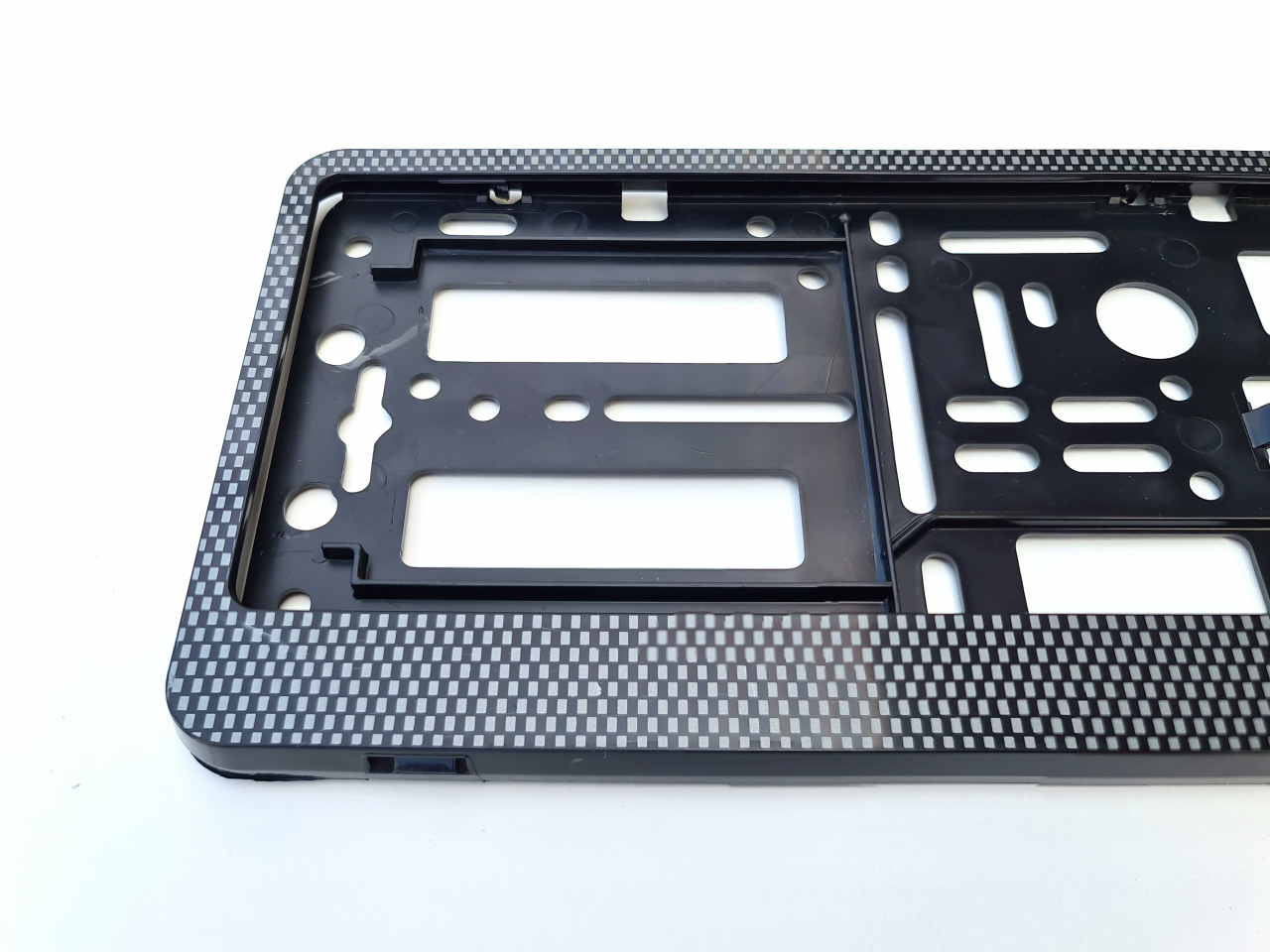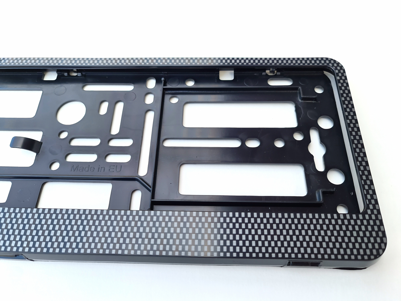 Die obere sichtbare Platte ist in Carbon Optik gehalten. Die hintere nicht sichtbare Trägerplatte ist aus stabilem Kunststoff.